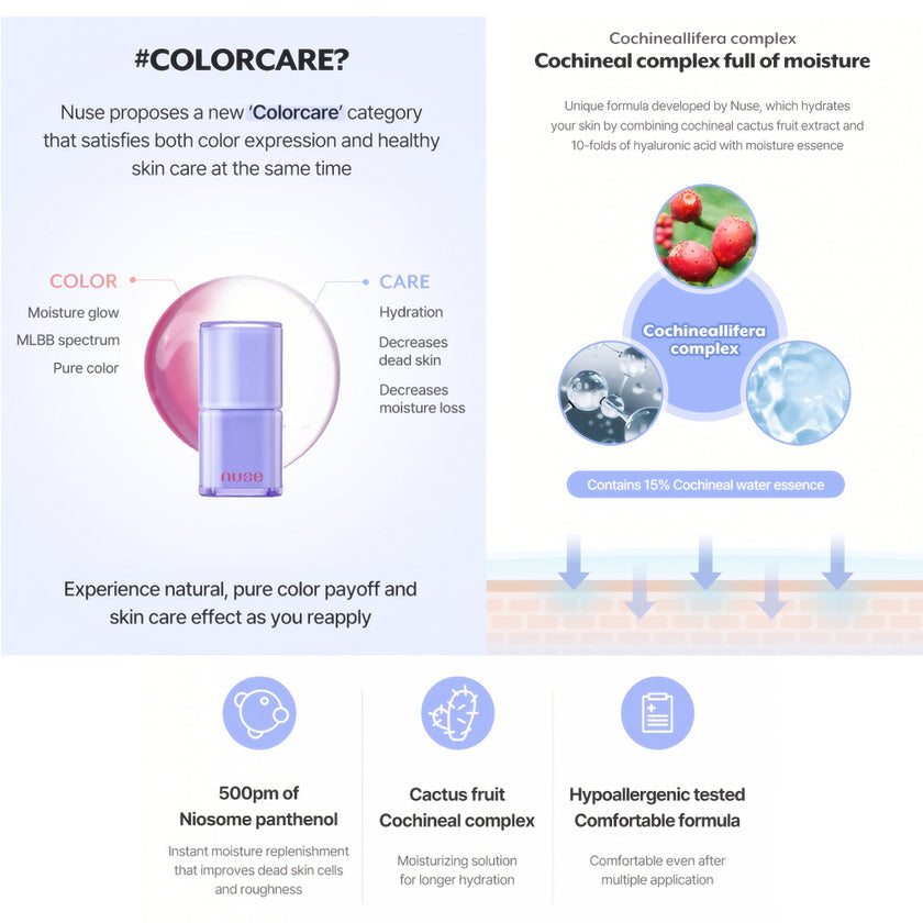 Nuse Care Liptual هو سيروم / تينت شفاه ملون نباتي ومضاد للحساسية، يخلق لونًا شفافًا ومنعشًا مع لمعة ناعمة وندى لؤلؤي على الشفاه. هذا التينت المرطب بشدة يعالج الشفاه الجافة كسيروم دون التسبب في تهيج الجلد أو ترك لمسة لزجة أو غير متساوية.