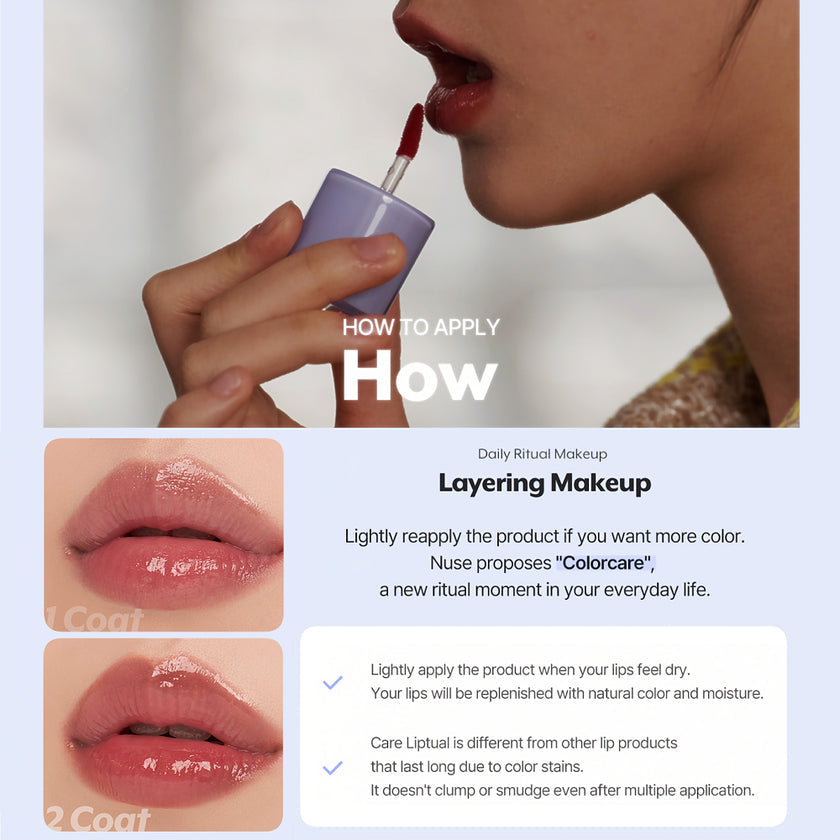 Thanks to the lightweight formula of this unique tint, the product can be reapplied and layered during the day as is or over lip makeup when desired - Care Liptual is designed to be used like a liquid lip balm, and it does not leave behind the drying stain that is often characteristic of lip tints!